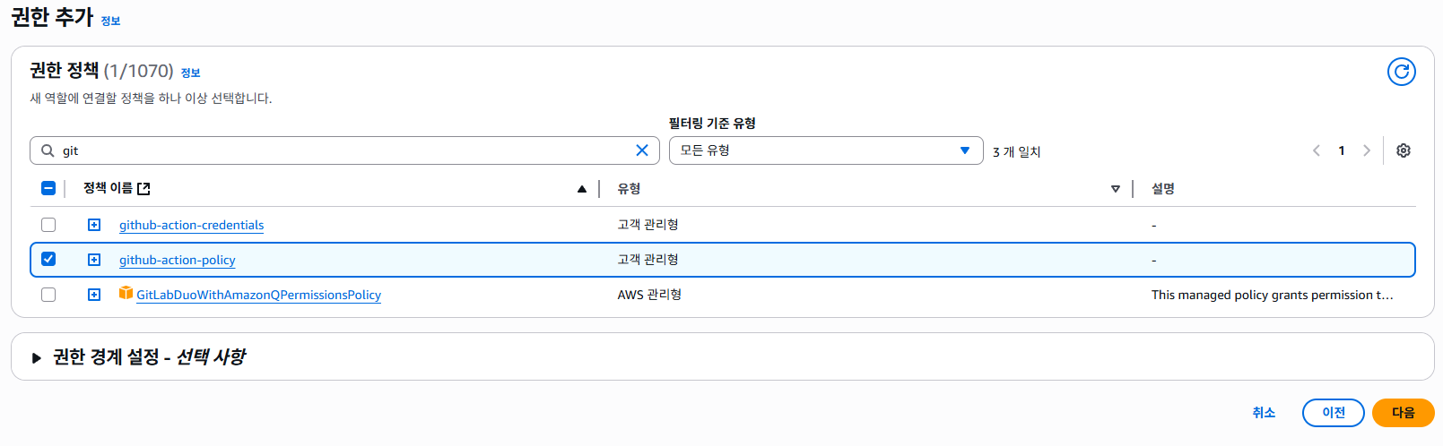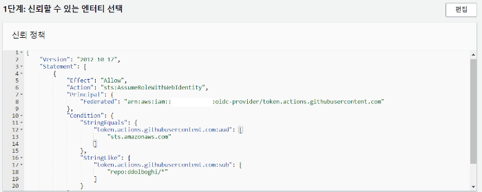 이 IAM 역할을 사용할 github repository, branch를 적어서 세세하게 설정할 수 있습니다.