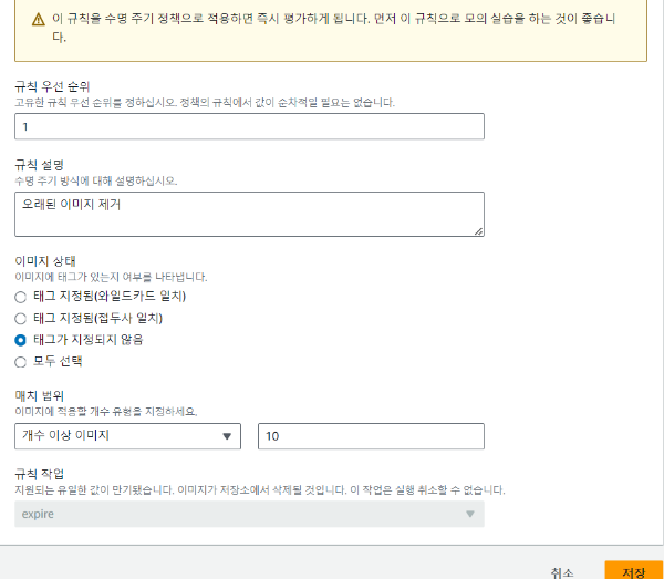 다음과 같이 설정하면 태그가 없는 이미지들은 최근 10개만 유지됩니다. 1로 해야 저장 요금을 더 많이 줄일 수 있습니다.