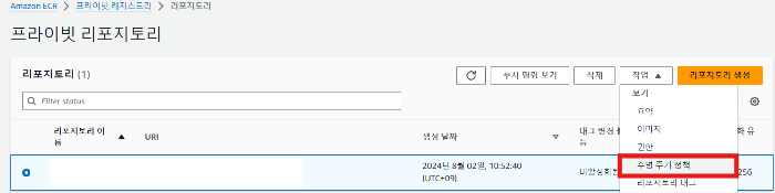 리포지토리를 선택하고 작업에서 수명 주기 정책을 클릭합니다.
